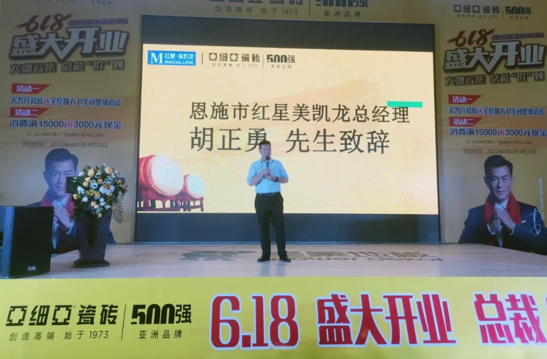 活动现场,恩施红星美凯龙总经理胡正勇在致辞中表示:“亚细亚瓷砖作为亚洲品牌500强,一直深受消费者和众多地标建筑的青睐。很高兴能有这样优质的品牌入驻,和红星强强联手一起共筑美好生活!”